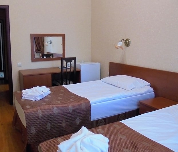 Пансионат представлен тремя зданиями, которые соединены между собой теплыми переходами. Каждый корпус состоит из трех этажей с лифтами. Спальный корпус оформлен в дворцовом стиле и рассчитан на двести четырнадцать мест. Он представлен одноместными и двухместными стандартными номерами трех категорий и двухкомнатными номерами Люкс. В некоторых номерах третей категории удобства расположены на этаже.